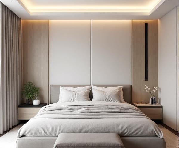 在效果图中,可以看到卧室的主墙采用了生态木拼花装饰,整体色调温和自然。这种装饰方式使得整个卧室充满了质感,给人一种舒适宜人的感觉。生态木拼花的纹路清晰自然,让卧室变得更加具有生活气息。